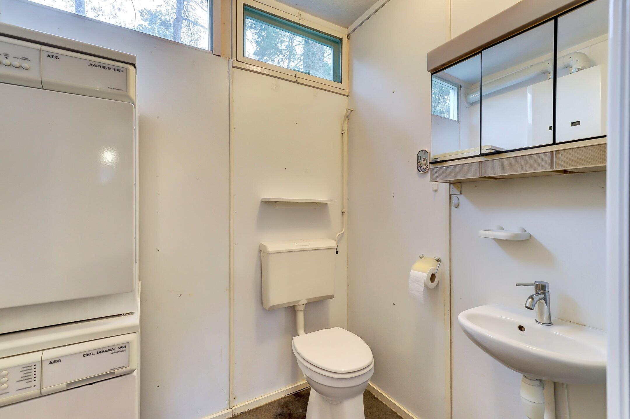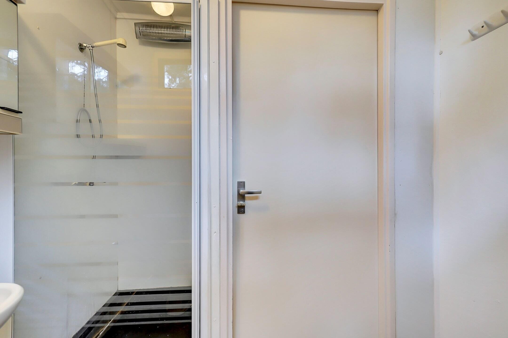 Vanuit de woonkamer bereik je de badkamer die voorzien is van een douchecabine, wastafel en toilet. Hier is ook ruimte voor het witgoed en hangt de Vaillant-ketel voor verwarming en warm water.